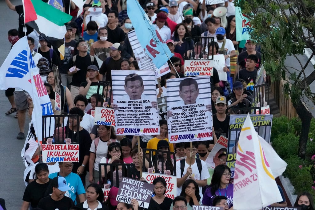 Протестиращите държат снимки на бившия президент Родриго Дутерте, докато призовават за справедливост за жертвите на войната срещу наркотиците по време на неговото управление в Кесон Сити, Филипините, през март 2025 г. Снимка: AP