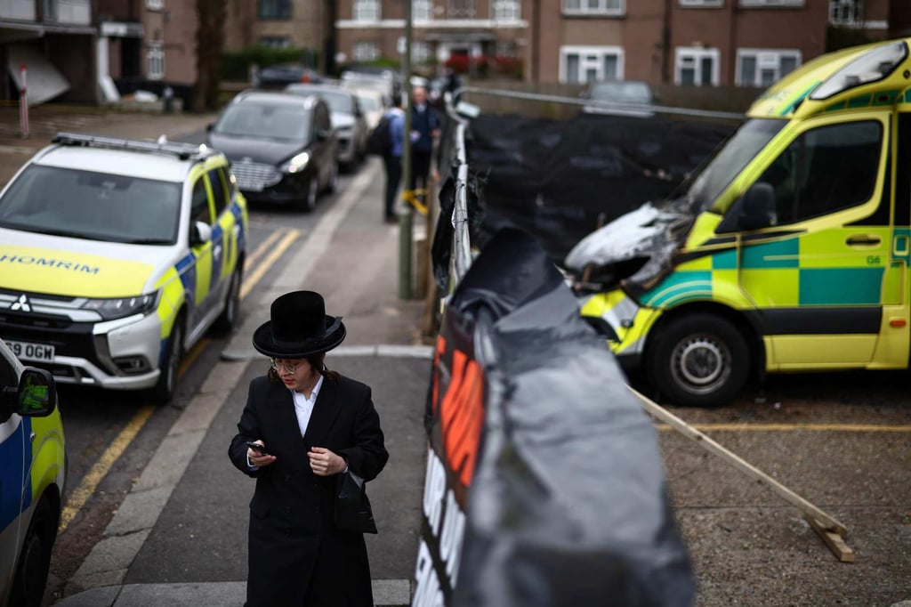 Член на еврейската общност минава покрай изгорелите линейки в квартал Голдърс Грийн в северен Лондон във вторник. Снимка: AFP