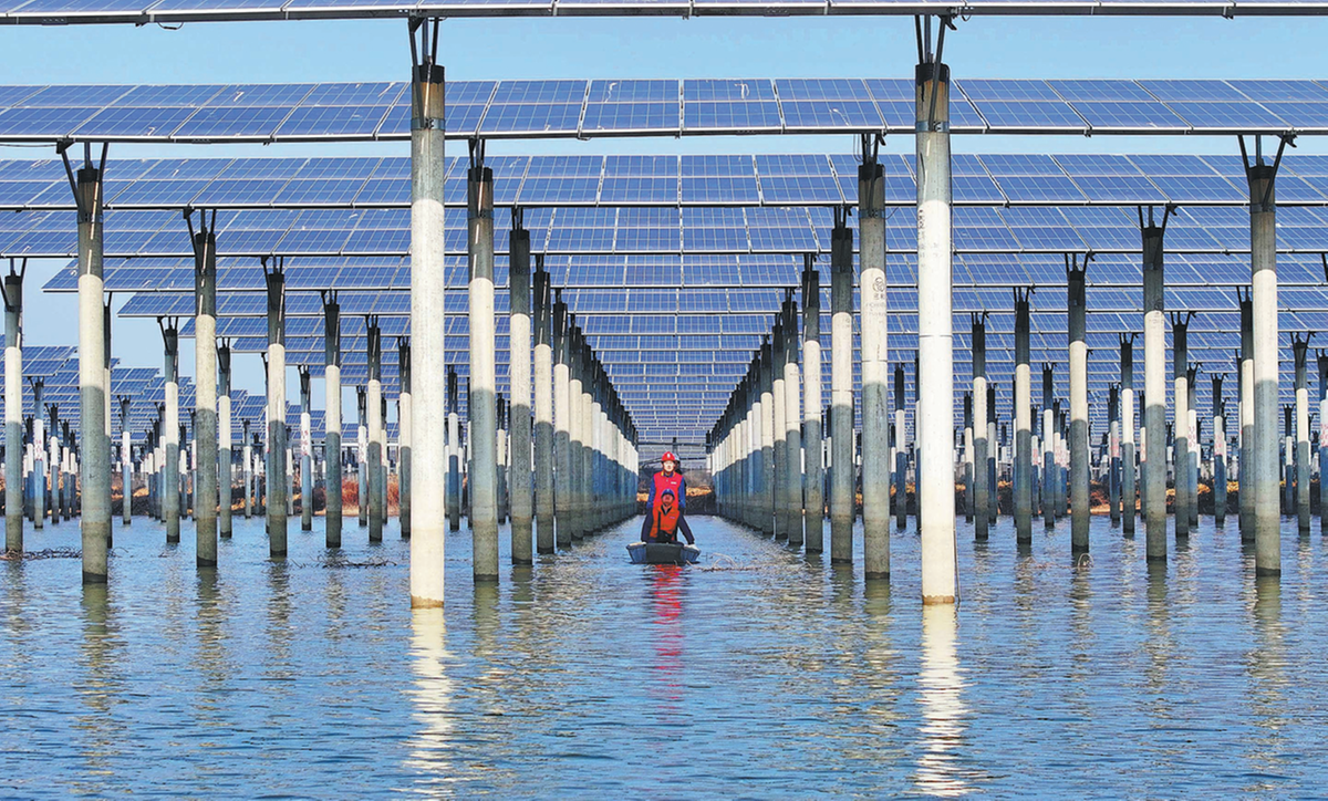 Служители инспектират фотоволтаични панели в слънчева електроцентрала в Tianchang, провинция Anhui, на 12 януари. SONG WEIXING/ЗА КИТАЙ ДАЙЛИ