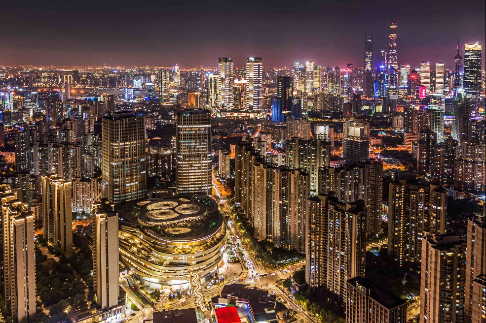 Нощен изглед към всеобхватния бизнес комплекс в международен стил Ruihong Xintiandi, разположен в квартал Hongkou в Шанхай. [Photo provided to chinadaily.com.cn]